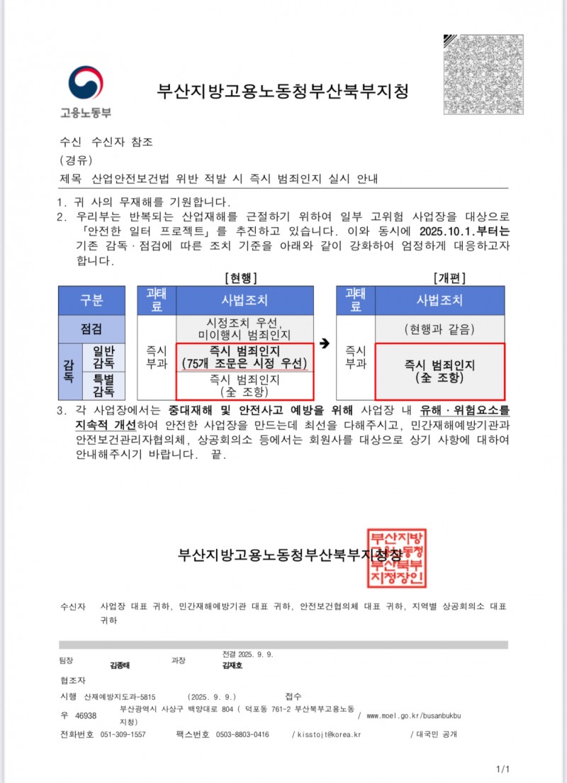 산재와의 전쟁, 25년 10월부터 '산업안전보건법 위반 적발 시 즉시 범죄인지' 실시