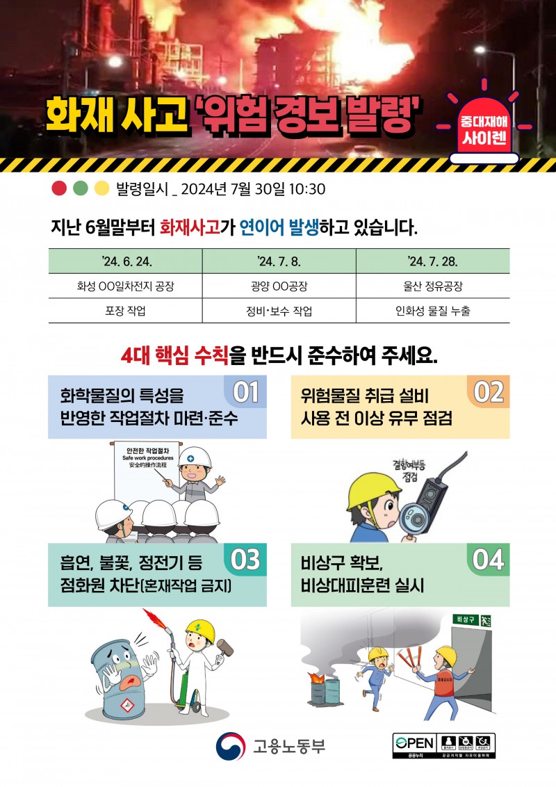화재사고 '위험경보 발령' 페이지 정보 작성자 최고관리자 댓글 0건 조회 1,122회 작성일 24-07-30 14:26 본문 지난 6월부터 화재사고가 연이어 발생하고 있으므로 4대 핵심 수칙을 반드시 준수 바랍니다(고용노동부 제공). 목록 이전글[중대재해 사이렌] 중대재해 모음(8월 3주차) 24.08.26